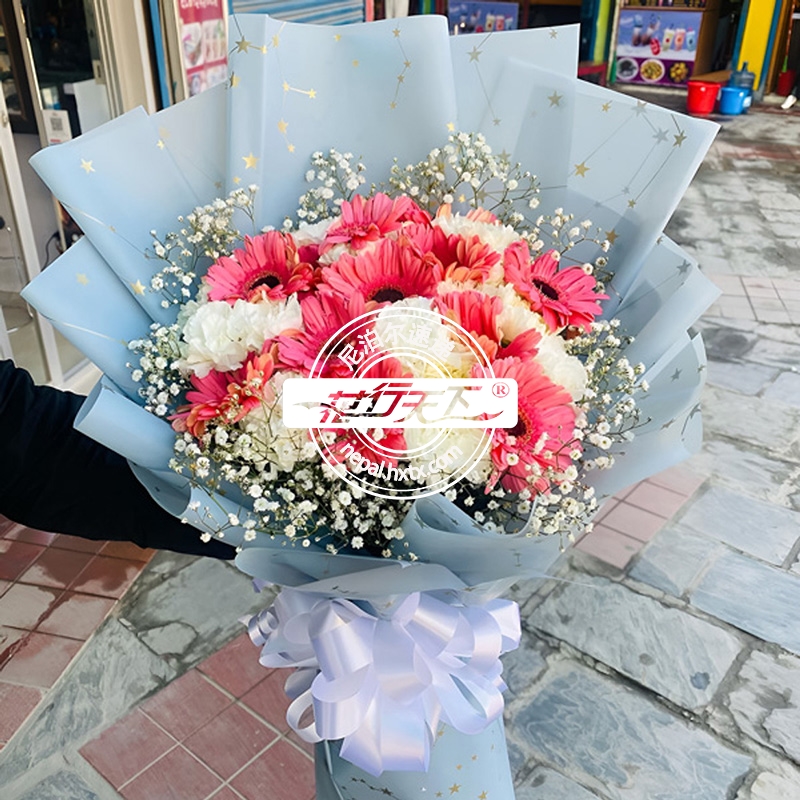 描述: 10枝粉色非洲菊、10支白色康乃馨、精美包装。